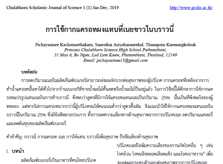 The Princess Chulabhorn Science High Schools (PCSHS) is a group of 12 regional high schools in Thailand established in 1993 with the goal of developing young Thai scientists. All PCSHS students in Matayom 5 (Grade 11) conduct an original experimental research project. Student research regularly results in valid, reliable findings which could be of value to others if published. In June, 2018 StudentScientists.Org began working with PCSHS to establish a scientific journal publishing the work of Chulabhorn students.